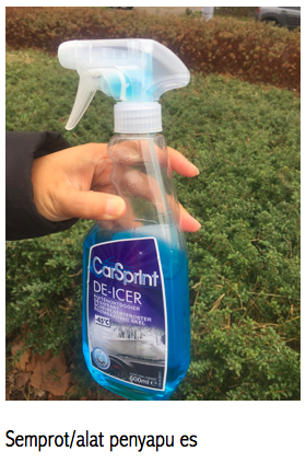 Disela-sela ini, aku dapet tips, yang aku gak perlu lagi kerik-kerik kaca mobil. Kaca mobil cukup disemprot, langsung saljunya mencair. Caranya?